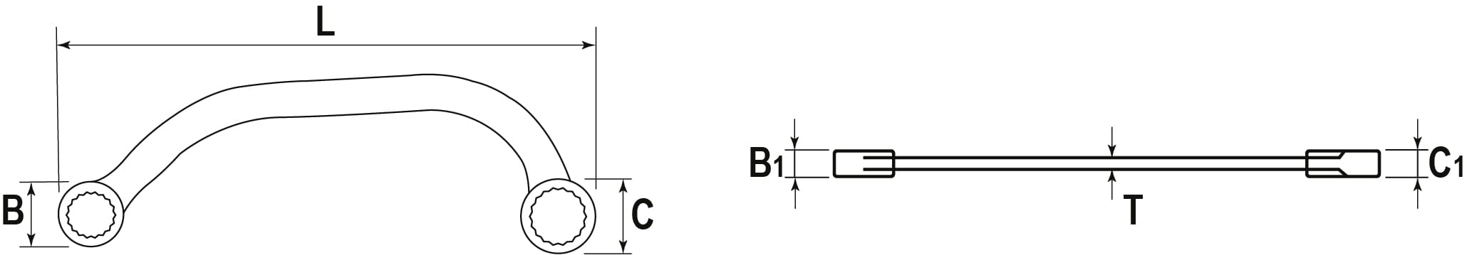 Гаечный ключ, разновидность накидного, с кольцевой 12-гранной рабочей частью без отгиба и смещения. Тело ключа изогнуто в виде буквы «С». Изготовлены из хромованадиевой стали, закалены, имеют хромоникелевое покрытие и финишную отделку «сатин».