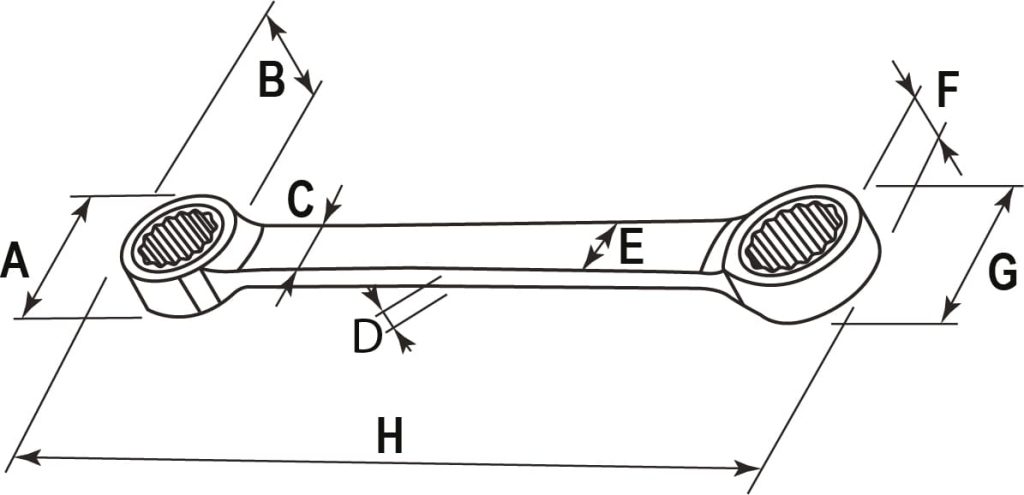 Прямой двусторонний накидной гаечный ключ, сочетающий две сопредельные по размерам рабочие части, снабженные храповыми механизмами с колесом в 72 зубца со свободным ходом в 5°, что обеспечивает удобство при работе в ограниченном пространстве. Ключ изготовлен по стандарту ANSI, имеет трехслойное хромоникелевое покрытие и зеркально отполирован.
